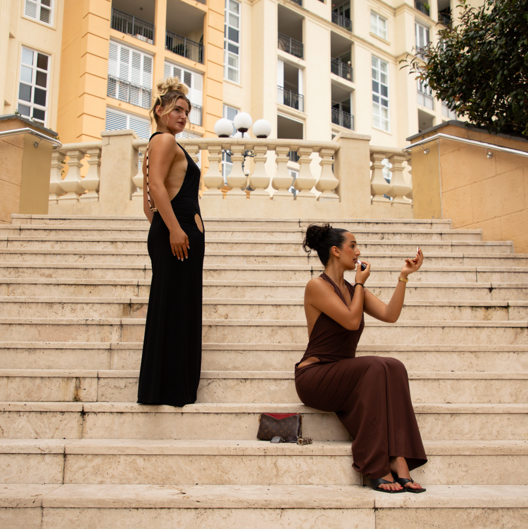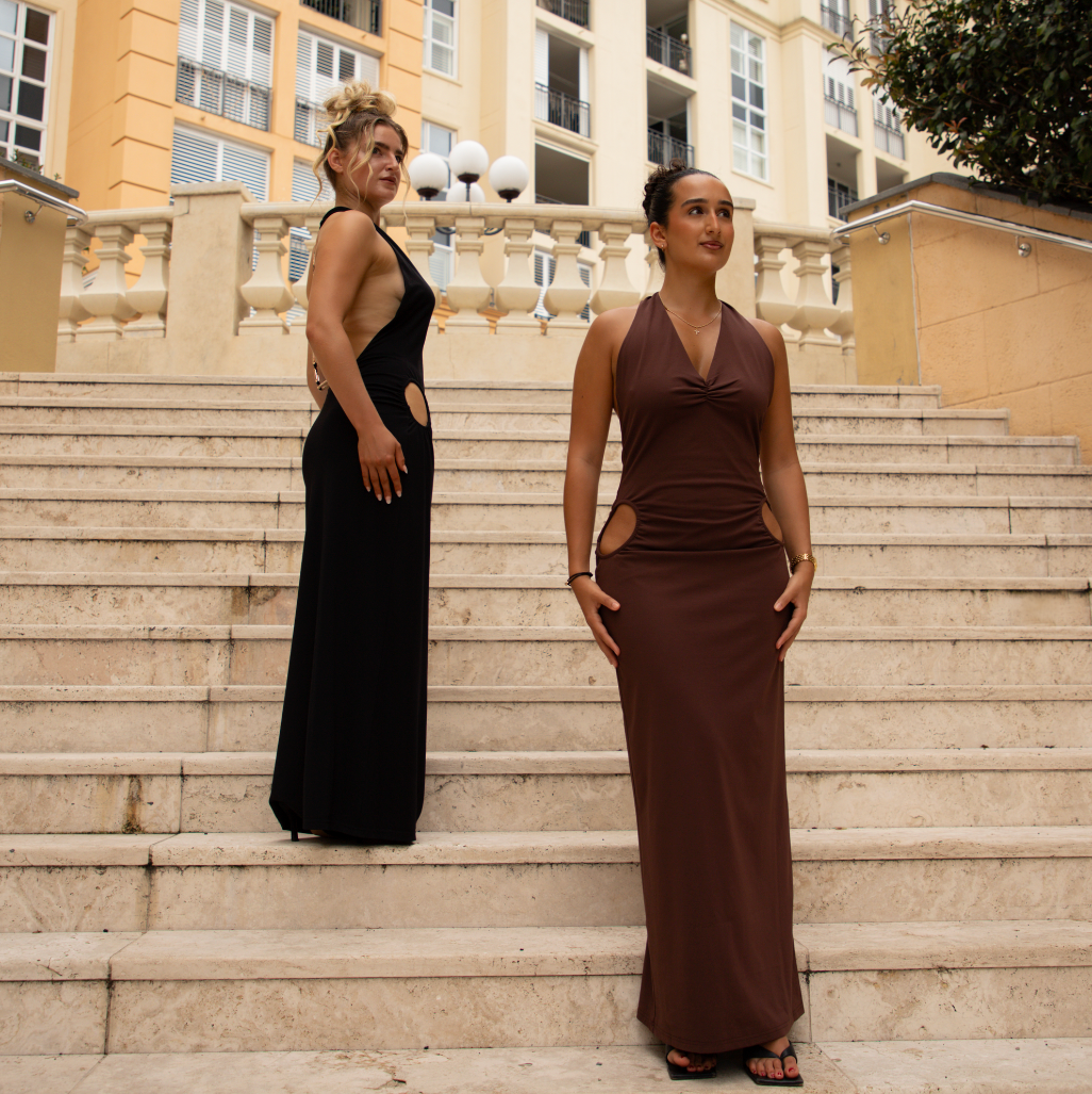 Hip cut-outs with ruching in between create a cinched effect that flatters the waist and hips, while the low scoop back adds a touch of elegance and boldness. The look is completed with gold metal detailing, elevating the piece.